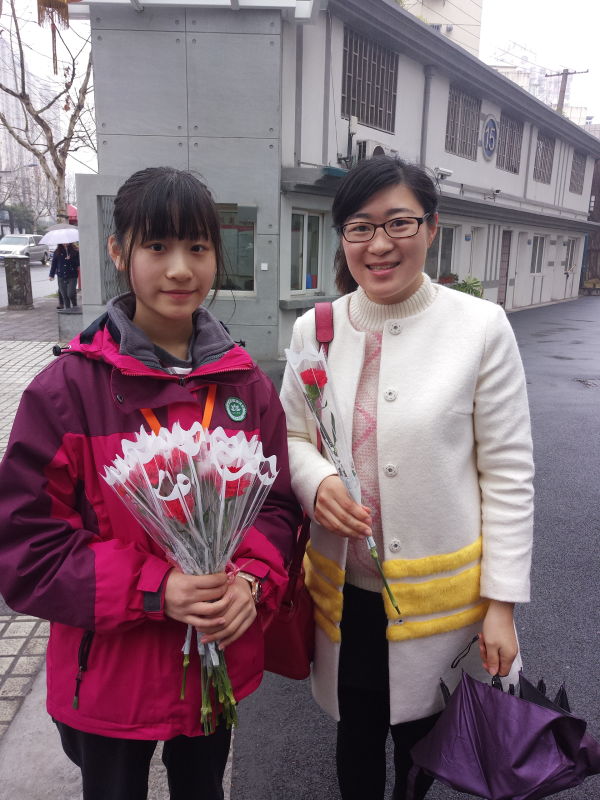 一朵鲜花、一句祝福、一份温暖,2016年的妇女节,阴雨天气,内心却如太阳般温暖。上海商业会计学校交通路校区中专部易班学生工作站成员一早就来到校门口,手捧康乃馨迎接女教师的到来。