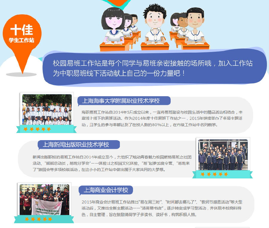 上海新闻出版职校的易班工作站自2014年成立至今,共组织了炫动青春魅力校园燃情易班之社团活动、"熊熊总动员,易班分享会"——体验日之校园文化体验、"易"起参加夏令营、"易班来了"游园会等多项校级活动,在这小小的工作站中做出属于大家共同的大梦想。