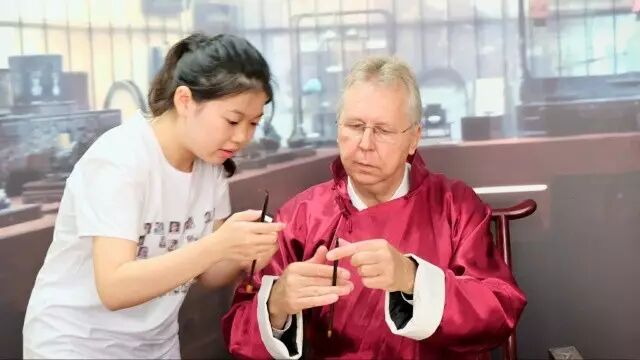 袁鸣婕同学介绍了会计开放实训中心和VBSE的课程。Mr. Uwe Burghardt目不转睛地学习着点钞和珠算。