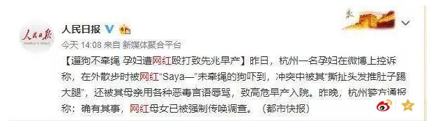 这两天最令人气愤的消息,莫过于一位有300多万粉丝的网红“Saya”把一位已经32周的孕妇打骂致先兆早产,现在还住着院没有脱离危险,原因竟然只是因为网红的一条狗冲撞孕妇,引起双方冲突。