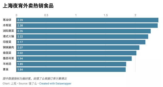 但如果是外卖的话,就会发现上海人夜宵最爱吃的还是自己的本土小吃——葱油饼,紧随其后的就是上海本帮菜,其余才是浏阳蒸菜、港式火锅、铜锅涮肉、羊肉汤等外地美食。