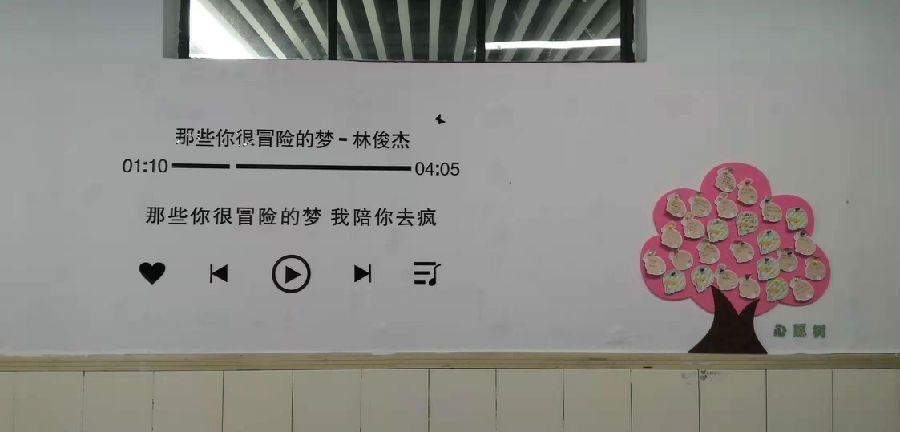 在一位同学的建议下,我们还在网上购买了歌词贴纸,把墙壁布置成歌词墙。