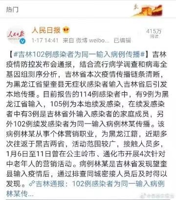 117日下午,吉林省疫情防控发布会通报,有102例感染者为同一输入病例林某传播。该病例林某从事个体营销职业,为黑龙江籍,近期多次往返于黑籍两省,活动范围较广,接触人员多。16日至11日承载公主岭市、通化市开展4次针对中老年人的营销活动。