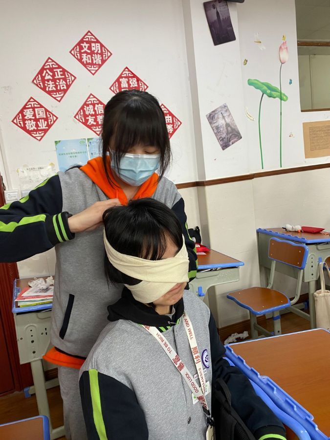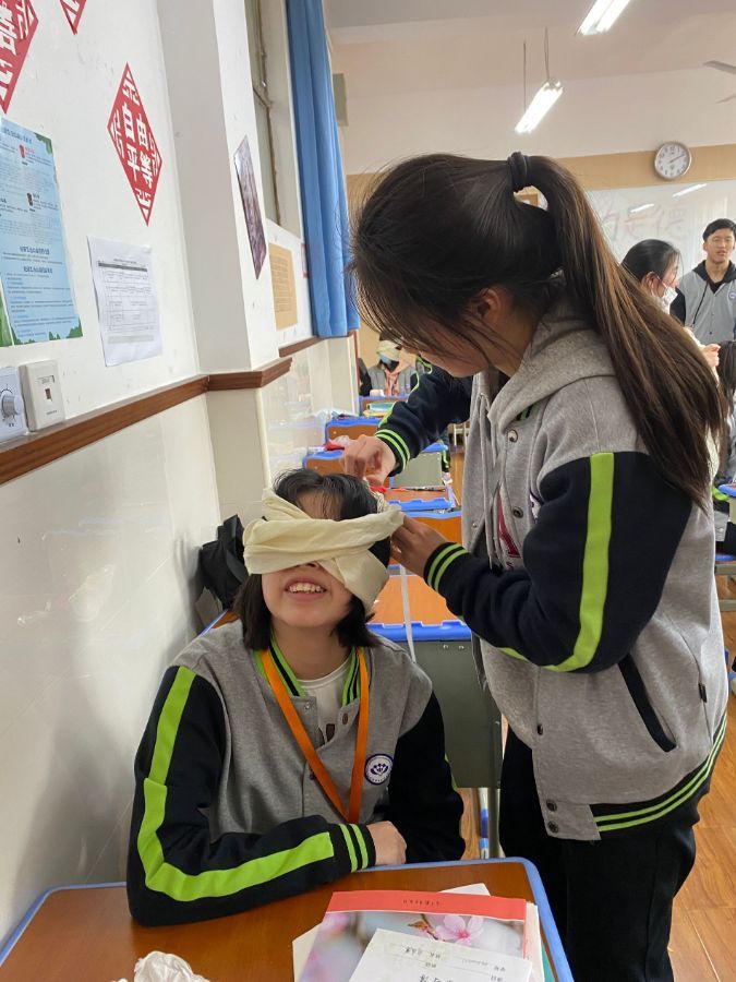 在战伤救护训练中,陈教官带领我们学习必备的知识和技能,他假设受伤的部位,再由我们判断出血的种类,制定包扎的方法及实施搬运都最有效手段。在这个过程中,同学们充分发挥动手能力和想象力。