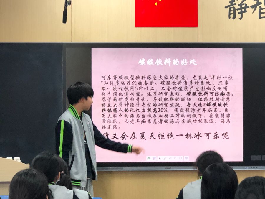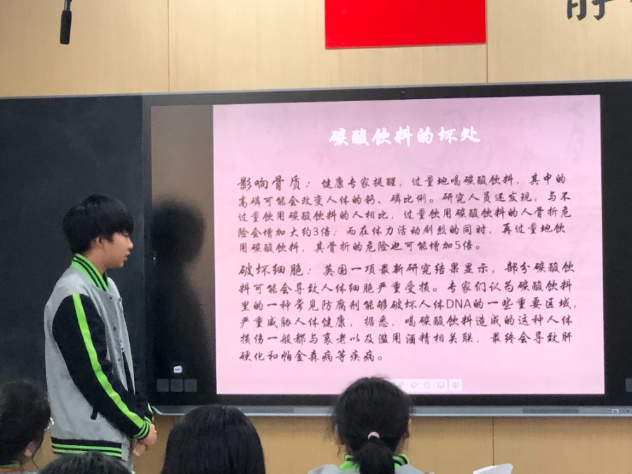 0552102班的田家骏同学在班会课上给我讲解了碳酸饮料的市场,好处以及坏处 ,并给同学们观看了相关视频,让同学们充分了解了常喝可乐带给我们身体的影响,但同时同学们也知道了适当喝可乐可以提高记忆力,预防老年痴呆等作用。