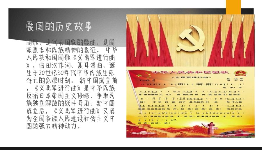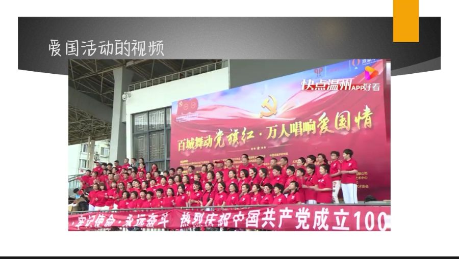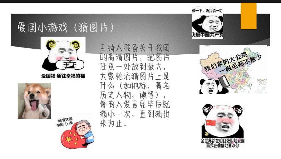 首先说了一下爱国青年的事迹,其次是爱国活动视频的总结,还有爱国的历史故事,最后玩了一个爱国小游戏。