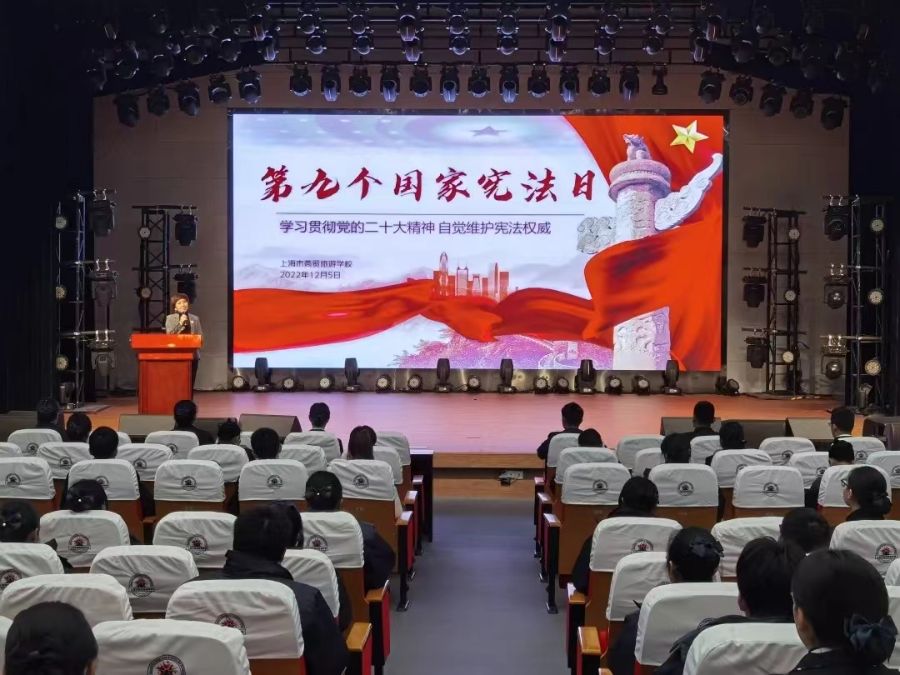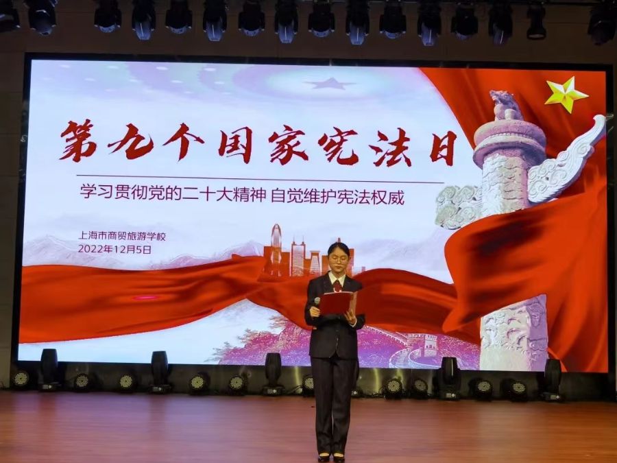 为进一步普及宪法知识、弘扬宪法精神、坚定法治信仰,在第九个国家宪法日到来之际,2022年12月5日早晨,上海市商贸旅游学校航空旅游专业部师生齐聚礼堂,举行晨读宪法活动。宪法是国家的根本法,是治国安邦的总章程,具有最高的法律地位、法律权威、法律效力,对经济、政治、文化、社会生活等方方面面都产生着重大而深刻的影响。本次活动分为三个环节:首先由20酒店管理专业吴颂飞同学主持国旗下的讲话,接下来,22旅游管理2班的沈梦婷同学领读宪法部分内容,最后思政教研组的白翎老师对本次活动进行了总结。