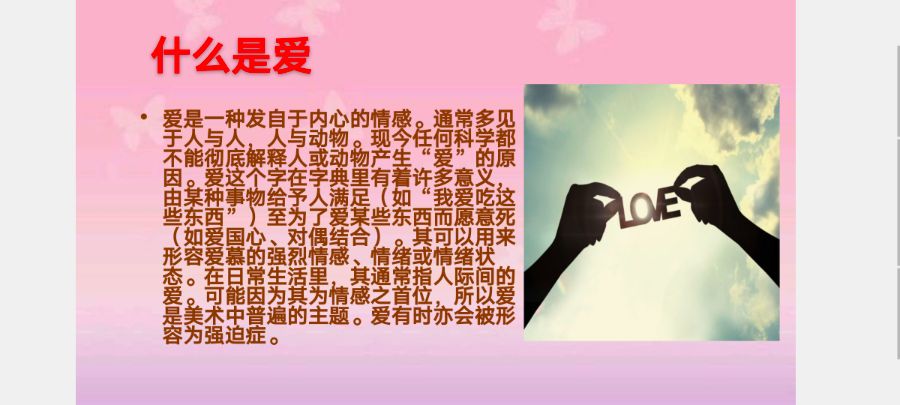 这周我们班开展了心理班会,主题是关于爱,爱是一种发自于内心的情感。下面是关于爱的讲解。
