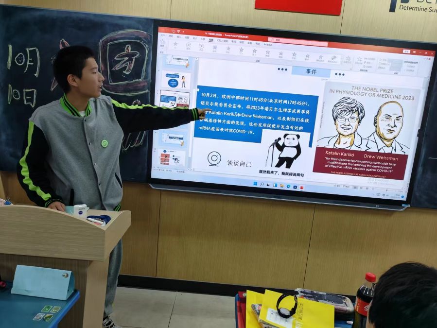 这天,班里的寇棋俊和李亦宝华两位同学给我们带来了新闻,分别是:亚运会足球和诺贝尔医学奖的颁布