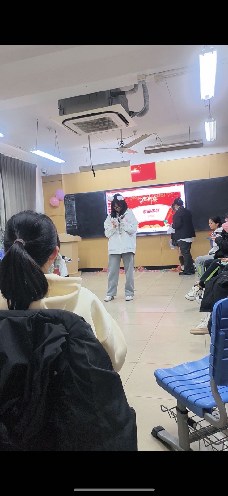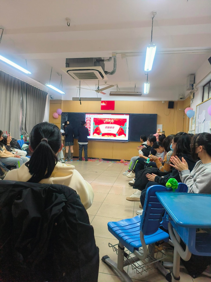 晚会的开始主持人富有感染力的的开场白让气氛高涨起来,第一个表演有三位同学朗诵了李白的《将进酒》语气中都流露着李白的豪迈,此后两位女同学也表演了甜美舞蹈。设置的游戏环节也是乐趣多多,抢椅子、听歌识曲,大家都积极参加,为了小礼物去争夺胜利。班里一部分同学编制了小型情景剧,祝贺大家迎接新的一年,在新年里也开开心心的。唱歌也是必不可少的表演,两位同学相继带来歌曲和串烧,让同学们享受其中,来一次听觉盛宴。晚会的最后主持人也预祝大家新的一年里能心想事成,所愿皆成真!