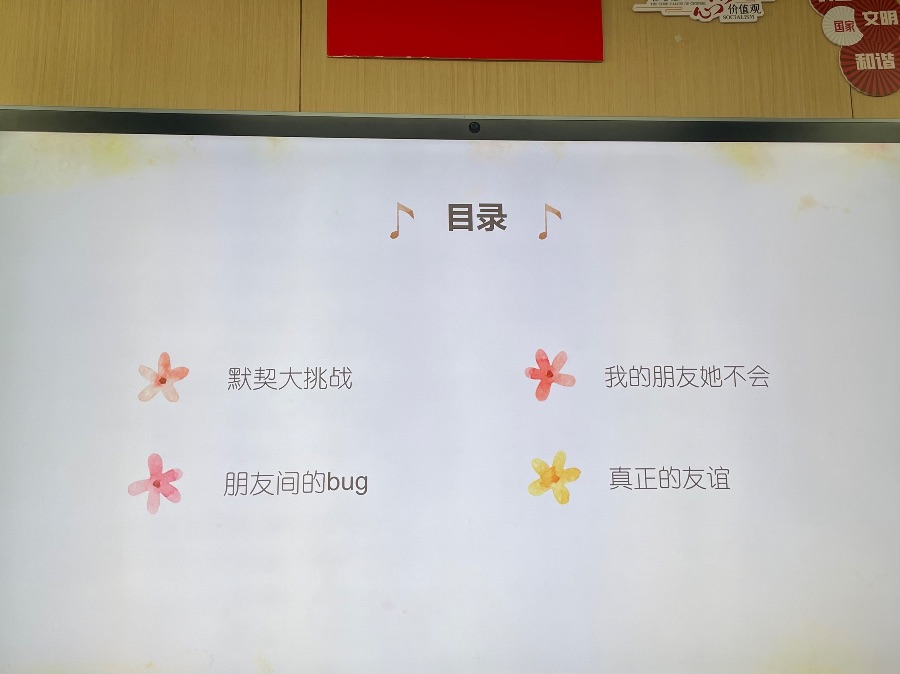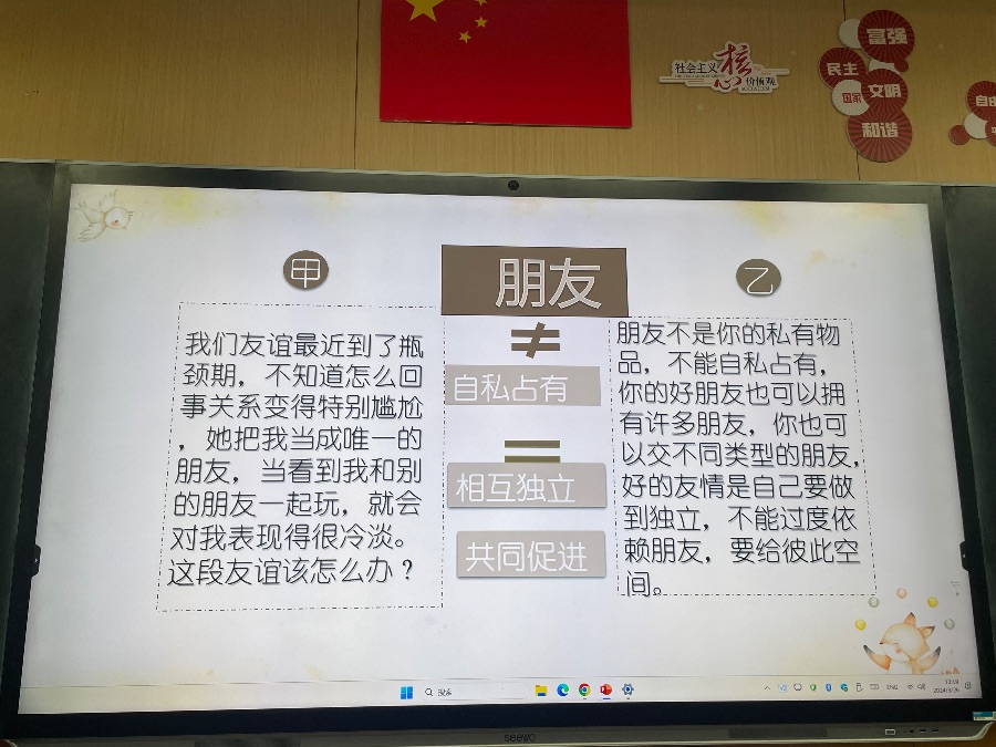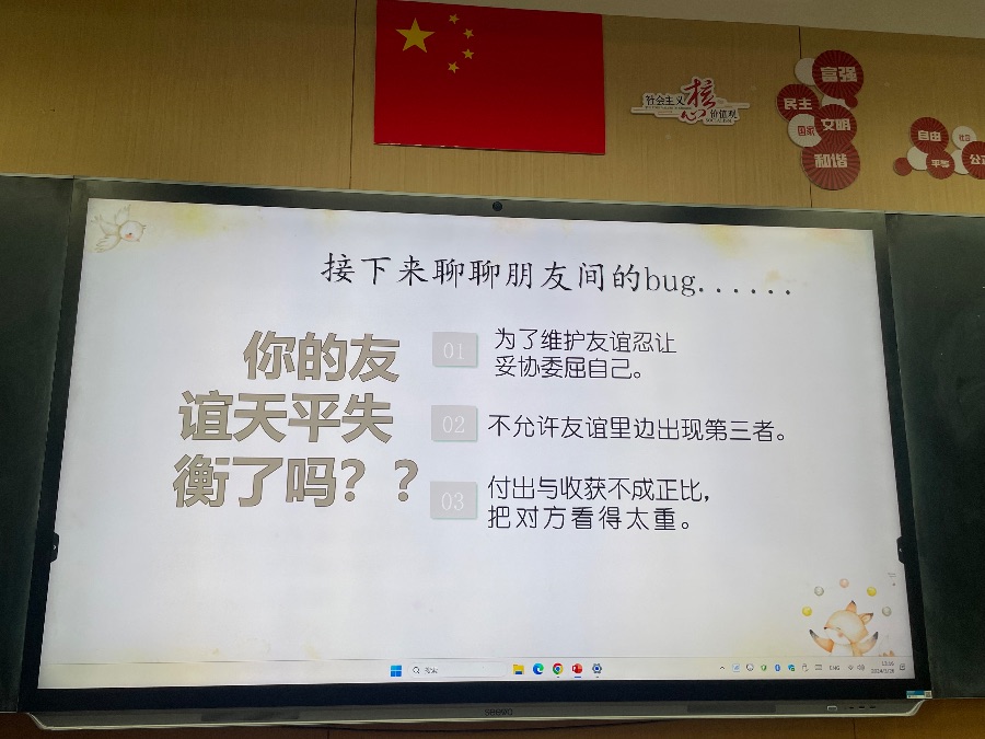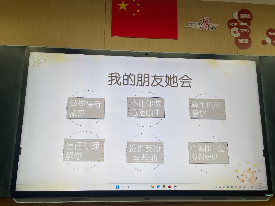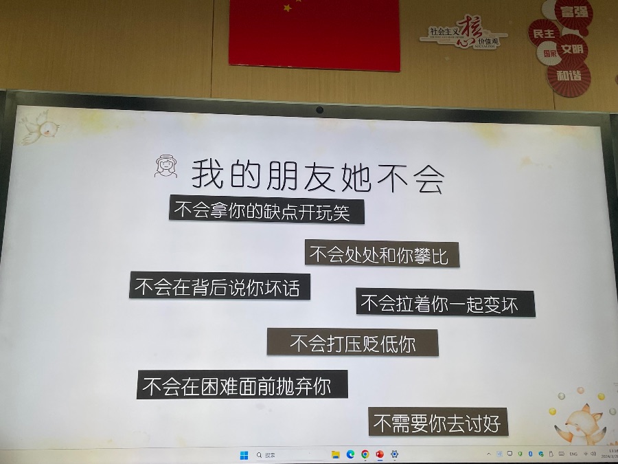 2024.3.26心理班会《我和我的小伙伴》,以友情为主题开展,进行了默契大挑战、我的朋友她不会、朋友间的bug和真正的友谊四个方面开展。朋友不是你的私有物品,不能自私占有,你的好朋友也可以拥有许多朋友,你也可以交不同类型的朋友,好的友情是自己要做到独立,不能过度依赖朋友,要给彼此空间。