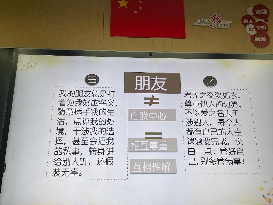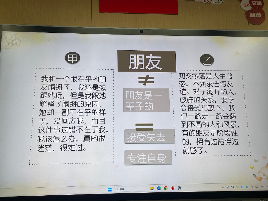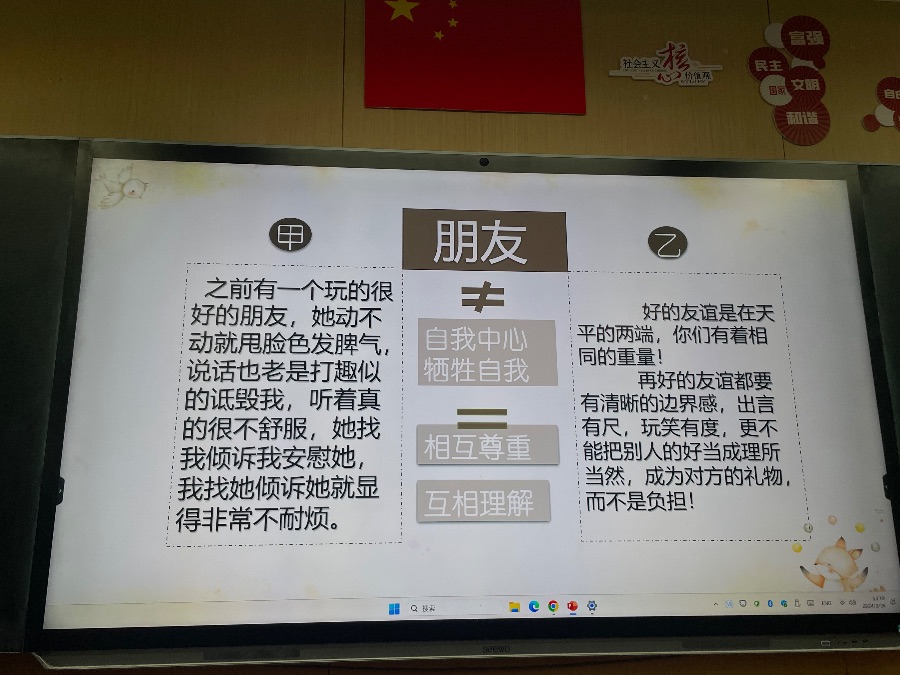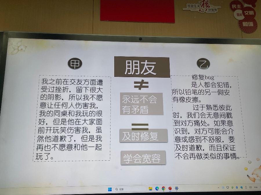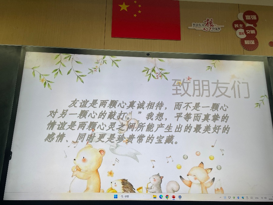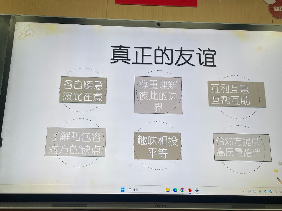 2024.3.26心理班会《我和我的小伙伴》,以友情为主题开展,进行了默契大挑战、我的朋友她不会、朋友间的bug和真正的友谊四个方面开展。朋友不是你的私有物品,不能自私占有,你的好朋友也可以拥有许多朋友,你也可以交不同类型的朋友,好的友情是自己要做到独立,不能过度依赖朋友,要给彼此空间。