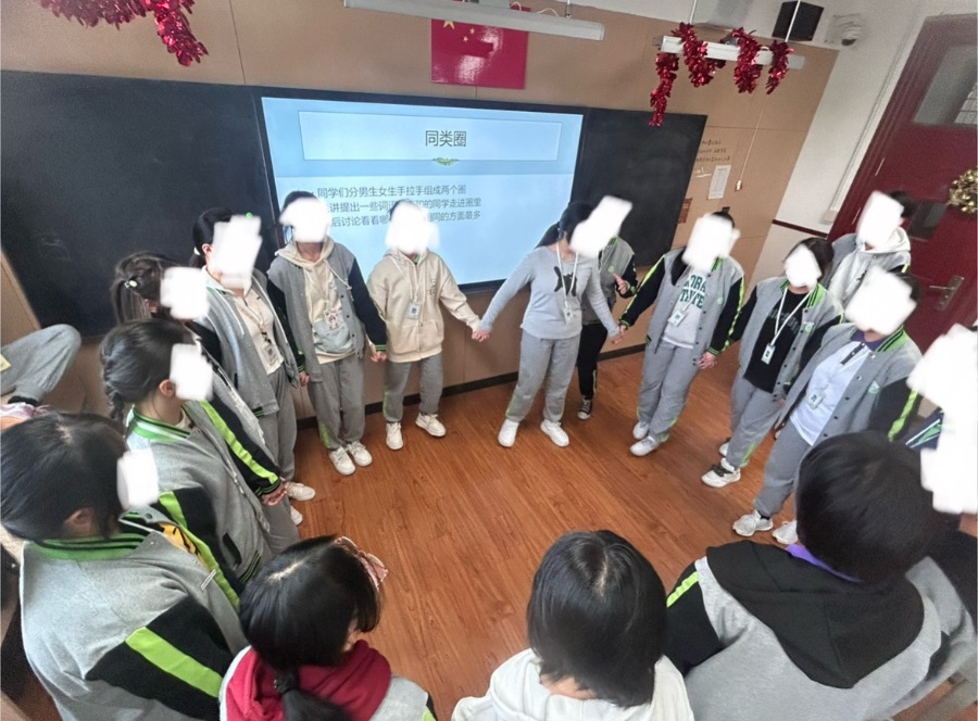 开始先以一个小故事引入 随即开展了一个名叫“同类圈”小游戏 大家一同拉手围圈 以主持同学说出其中一个小特征 带有特征的同学进入圈中!找到了很多相同特征的同学哦