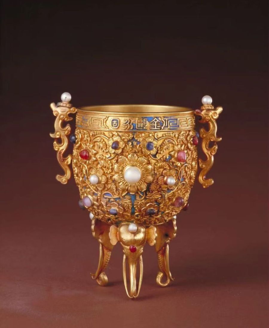 金瓯永固杯是清朝乾隆年间制造的金制酒杯,高12.5厘米,口径8厘米,足高5厘米。其杯口铸有金瓯永固,寓意江山永固,杯身錾刻宝相花,花蕊以珍珠及红,蓝宝石为主,两侧各有一变形龙耳,龙头上有珠,三足为象首式,额顶及双目间亦嵌珠宝。