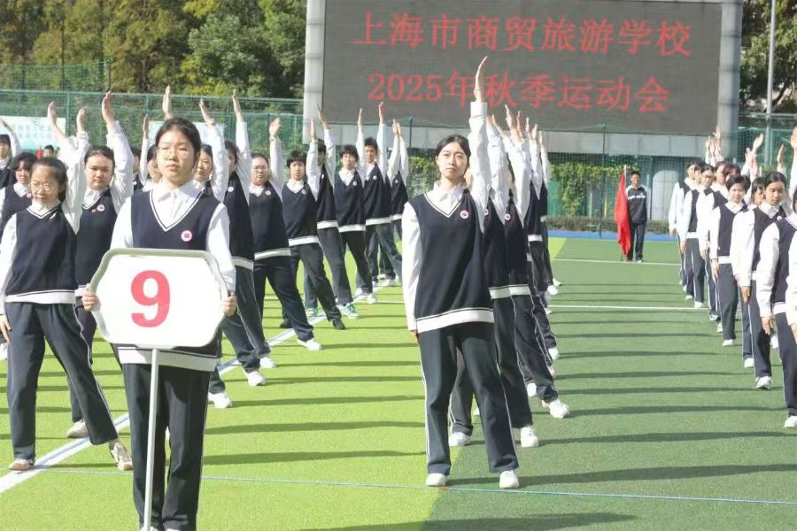 2025秋季运动会的绿茵场,被24营销班的白衫藏青背心点亮。举着牌子的同学稳稳站定,身后的我们抬臂成线——广播体操的每一个伸展都踩准节奏,校服衣角随动作轻扬,连掌心向上的角度都像被标尺量过般一致。