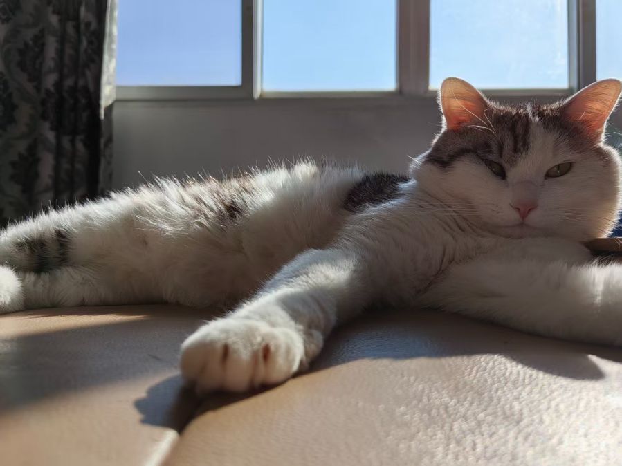 它的身子舒展成慵懒的弧度,前爪随意地向前伸着,肉垫粉嫩的轮廓藏在蓬松的白毛里,显得软乎乎的。雪白的皮毛上缀着几缕浅棕的斑纹,尤其是额头处的花纹,像晕开的墨点,添了几分俏皮。阳光拂过它的毛发,让白色的绒毛泛着细腻的光泽,连每一根细毛都清晰可见。