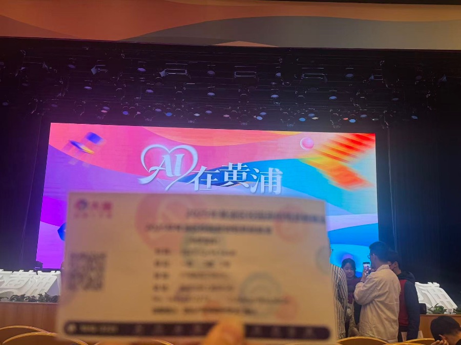 会场内的舞台场景里,巨大的LED主屏占据了视觉核心,屏幕上以粉紫蓝渐变的流体色块为背景,灵动的曲线纹理如揉碎的霓虹光带,“AI在黄浦”的白色艺术字醒目地悬浮在画面中央,其中“A”与“I”被设计成交织的爱心轮廓,让科技主题多了几分柔和的创意。