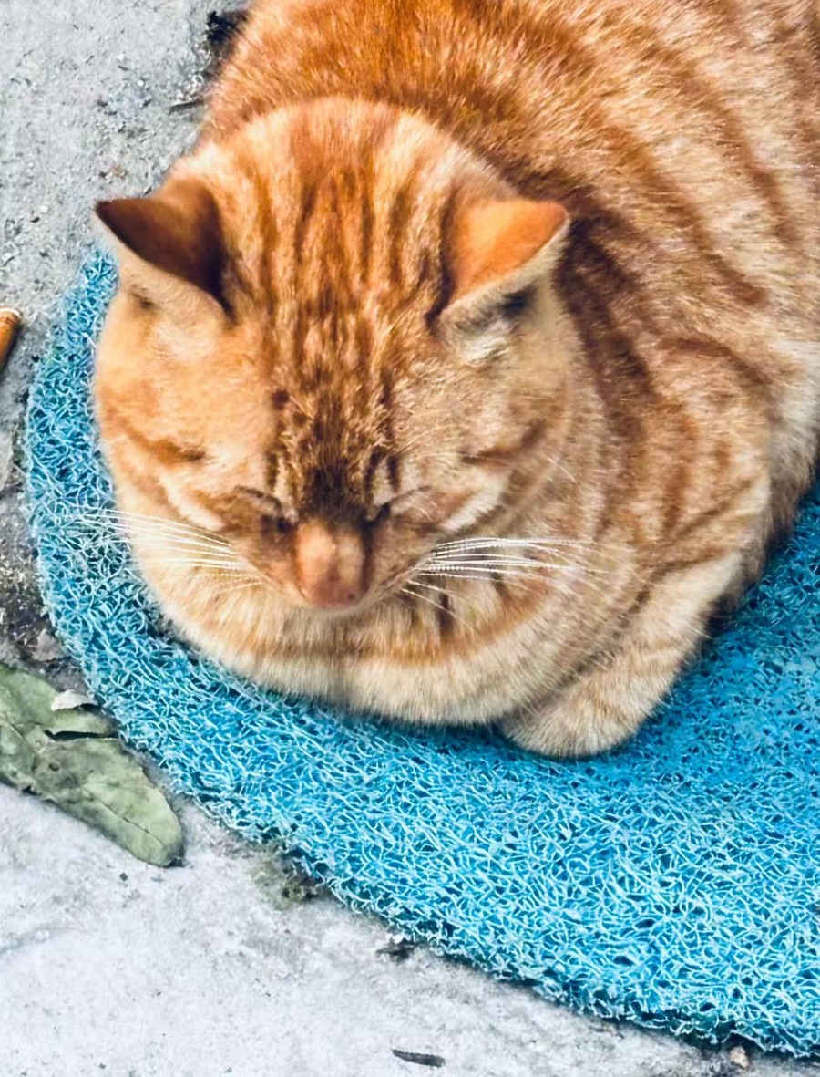 水泥地面上,一只橘色狸花猫正蜷成一团,把自己安放在一块蓝色的网状垫子上,享受着午后的慵懒时光。它的皮毛是温暖的橘色,间杂着深浅不一的虎斑纹,在光线下泛着柔软的光泽,像被阳光晒透的绒线。它的眼睛紧紧闭着,长长的睫毛垂落下来,鼻尖粉嫩,胡须微微颤动,仿佛正沉浸在一场香甜的梦里。耳朵温顺地贴在头顶,整个身子团成一个蓬松的球,连爪子都藏进了绒毛里,只露出一小截带着条纹的肉垫,透着毫无防备的慵懒。旁边散落着一片枯皱的绿叶和一截烟蒂,粗糙的水泥地与它柔软的身躯形成鲜明对比。这只橘猫仿佛与周遭的烟火气融为一体,在喧嚣的尘世里寻得一隅安宁,用酣眠对抗着时间的流逝,让人忍不住放轻脚步,生怕惊扰了这片刻的温柔。