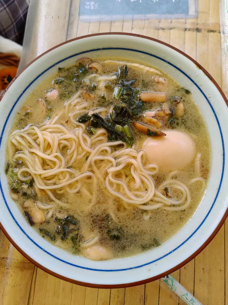 一碗冒着热气的家常汤面,盛在带着蓝红双圈纹的白瓷碗里,暖黄的汤汁泛着细密的油泡,裹挟着麦香的细面在汤中舒展缠绕,像春日里舒展的藤蔓。半颗溏心蛋卧在面旁,蛋白莹润,隐约透出内里的嫩黄,是整碗面最温柔的点缀。切碎的深绿菜叶与浅褐菌菇散落其间,菌菇的鲜气混着蔬菜的清冽,随着热气漫溢开来。木桌的纹理在碗底若隐若现,旁边还露着半截印着青竹纹样的筷子,仿佛下一秒就要挑起一缕面,裹着汤汁送入口中,暖意在舌尖与胃里同时漫开,是最朴素也最治愈的人间烟火。