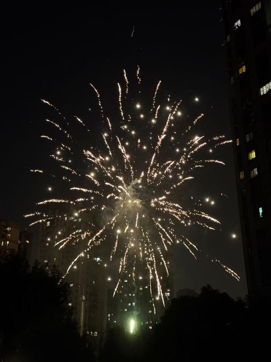 细碎的光痕拖着长长的尾巴,在楼宇间流转,把对面楼的窗户都映成了暖黄。我掏出手机,却发现镜头根本装不下这漫天的璀璨,索性放下手机,仰着脖子看。烟花一朵接一朵地绽放,有的像蒲公英的绒絮,有的像垂落的金柳,把原本沉寂的夜晚衬得热闹又温柔。身边的邻居们也探出头来,孩子们的笑声混着烟花的声响,在风里飘得很远。