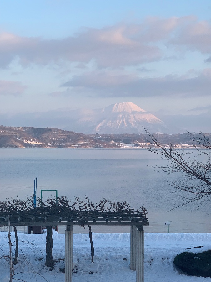 天色清浅,淡蓝的天空里晕着几缕柔粉的云,像被晨光轻染过。远处覆雪的山尖在薄雾里静静伫立,柔和的光线为雪面镀上一层暖调的柔光,轮廓朦胧又清绝。山脚下的湖水漾着细碎的波光,像一块沉静的蓝玉,将远山与天色温柔地映在其中。近岸的雪地干净松软,藤蔓架的枯枝、光秃的枝桠静静立着,带着冬日独有的清寂。风似乎都放轻了脚步,整个世界都浸在一种温柔又辽阔的静谧里,只有远山、湖水与落雪,在晨光里铺展开一幅干净又治愈的冬日画卷。