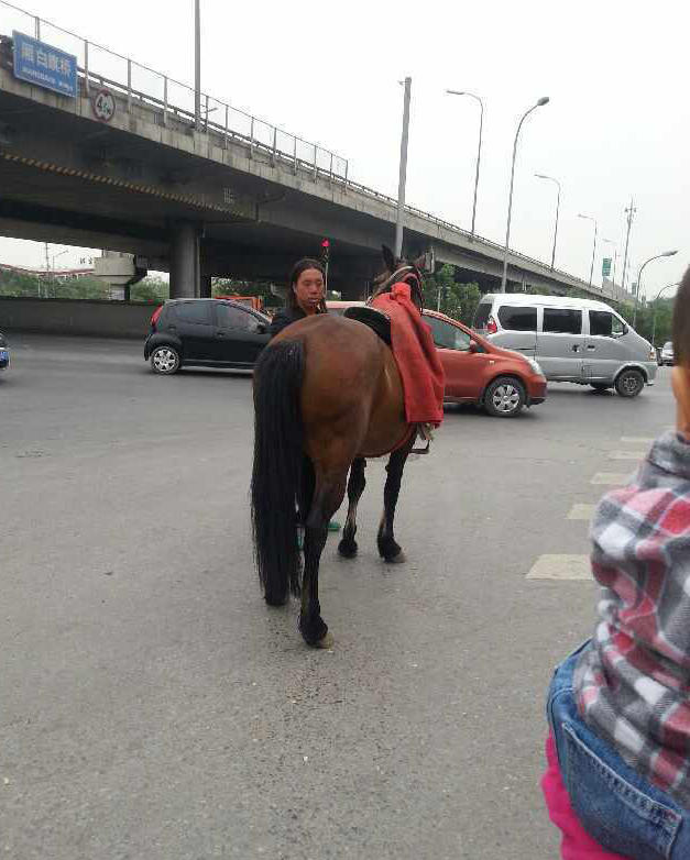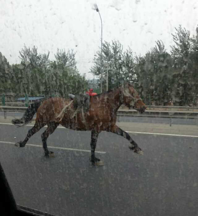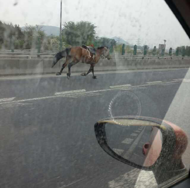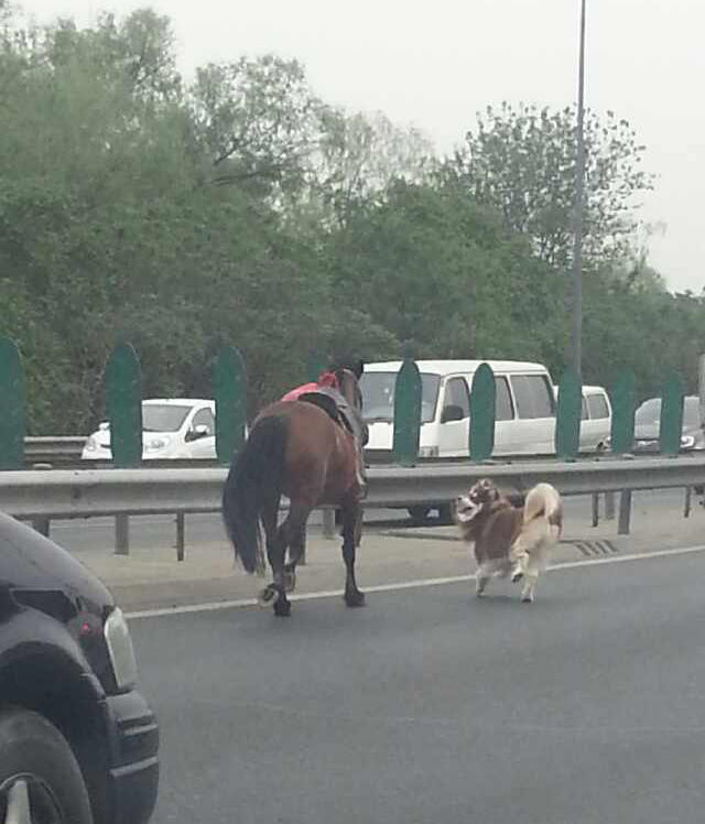 5月10日上午10点左右,一匹带着马鞍的马“溜达”上北京北五环,虽然主人在后面狂追,众多私家车主试图将其别住,但均因马儿跑得太欢而无果。就在众人一筹莫展之时,一位看热闹车主的爱犬“看不下去了”,它从车内蹿出后直接冲向这匹马。北五环上,一马一狗在前面跑,两位主人在后面狂追,最终在众多私家车主的帮助下,这匹马被截停,这条狗也被主人抱走。