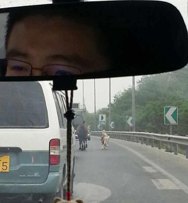 林先生回忆说,跑了一阵后,在万泉河桥段附近,马累了,开始沿路溜达了起来,不少车也跟着减速“围观”。旁边的一辆宝马就是减速的车之一,车主是名女子。看到主人一直注视着窗外,车里的一只黄狗也跟着将头探出车窗。很快,狗发现了马后就“兴奋”起来,一头扎下车就向马跑去。马一回头看到了狗,受到了惊吓,又开始在路上飞奔起来,狗也跟着在马后面加速奔跑。