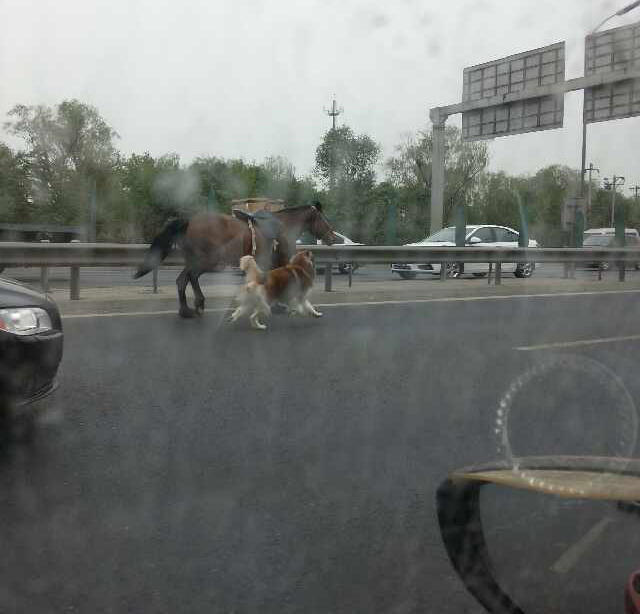 路上的司机见状,纷纷帮着一起再次试图别停这两只动物。林先生说,最终,10点20分左右在上地出口处,马被截停了下来,狗被宝马车主抱走,而马的主人气喘吁吁地牵住了马的缰绳,整条路恢复了正常。