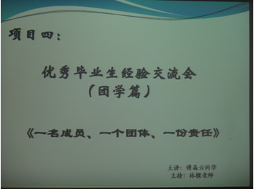 2014年5月30日中午13:00,在2号楼6楼录播室,12、13级团学干部召开了由学生处林樑老师主持的题为《一名成员、一个团体、一份责任》优秀毕业生经验交流会。