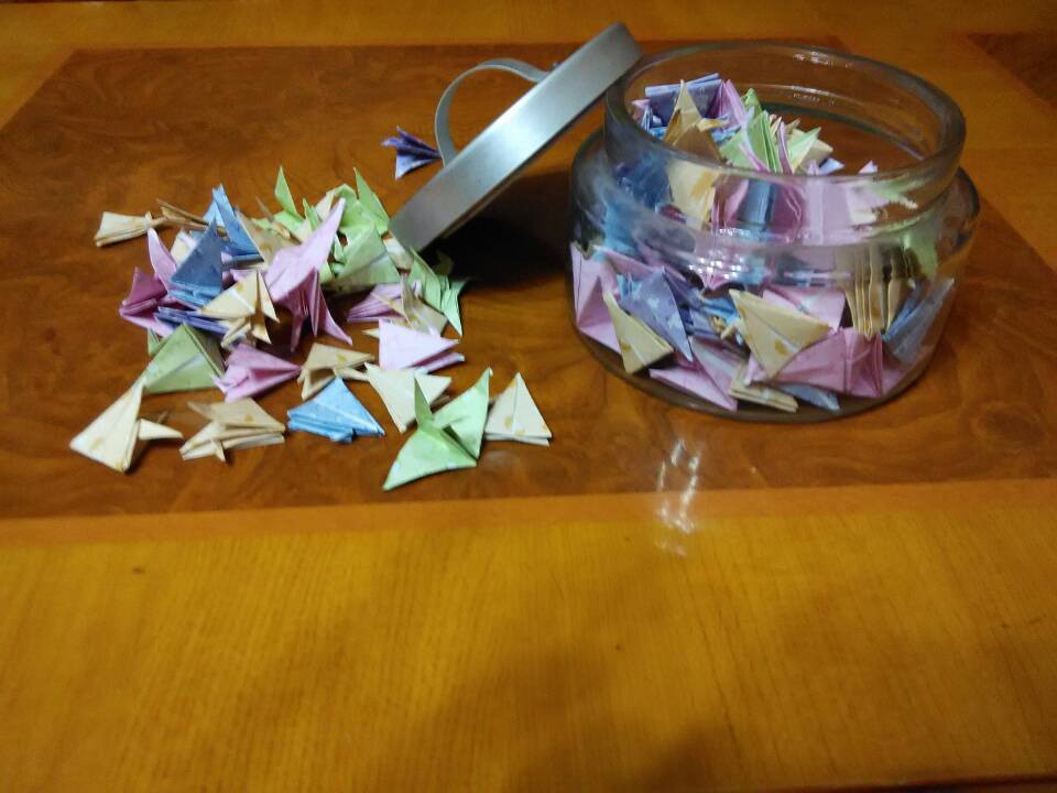 同学们折了好多千纸鹤,在千纸鹤里面写了自己对于未来的梦想,和对老师、家人、同学的祝福。