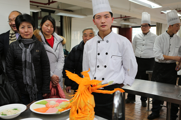一走进烹饪教室,我们就被桌上用南瓜雕刻而成的栩栩如生的凤凰所吸引。这是烹饪项目同学练习的食雕作品。烹饪项目组由蔡老师和夏老师负责。蔡老师是一个很负责任的老师,他不年轻,但是他有一颗爱学生的心!这次的星光比赛由于有两个一年级选手,所以难免会有些担忧,但是蔡老师说他们都很认真地参加训练。每天早早地来到学校,一待就是一整天!一个雕刻作品就要花上几个小时。对一年级刚参加训练的同学来说更加有难度,有挑战。比赛是由抽签决定的菜系!但是冷盘以及两个热菜是规定的,所以运气也很重要!这个项目是需要花时间和耐心的,每位选手都要很努力,刻苦。我相信他们自己也一定很希望自己获得好成绩!
