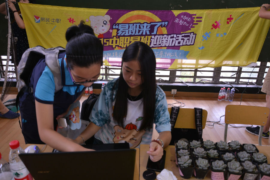 在志愿者学长学姐都带领下,鲜肉们来到了校体育馆的报名地点。各项报名工作都有条不紊的进行着,在老师和学长学姐的耐心讲解下对学校的有了大致的了解。在报名工作顺利结束后,小鲜肉们遇见了热情的易班学长学姐以及可爱的易班熊。鲜肉们好奇的来到了易班的工作摊位,开始了与易班这个新鲜而神秘的新鲜家庭的第一次接触。在易班老师以及学长学姐的细心讲解和耐心指导下,小鲜肉们对易班这个组织有了大致的了解。在细心的学姐的帮助下注册了易班帐号,顺利的加入了易班这个大家庭中。