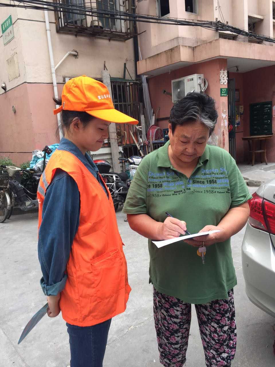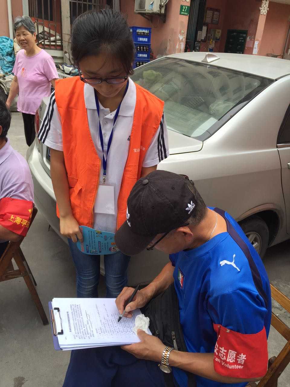 下午一点,戴上亮眼的橙黄色帽子,穿好印有宝山志愿者字样的服装,同学们整装待发。分别前往宝山的各个小区街道,对当地居民进行社区安全感满意度的调查问卷活动。艳阳高照,浓浓的暑意却挥不走我们满载的热情与激动,远远的走来一位满头银丝,步履蹒跚的老奶奶,我们走上前,在获得老人的同意后,开始调查问卷。奶奶80多岁了,我们便把题一道道读给她听。渐渐的,周围来了几位围观的居民。我们趁热打铁,一边给每位围观的居民都发了一份调查问卷,一边把小礼品塞到他们手里。很快,我们收到了一打完成的问卷。